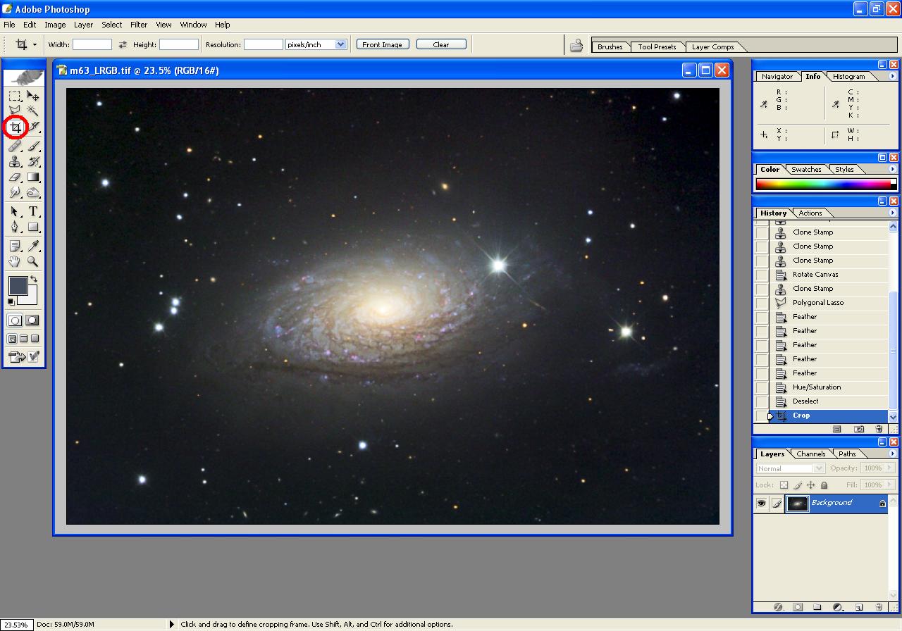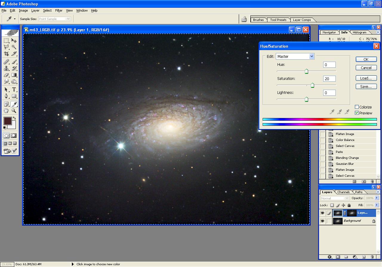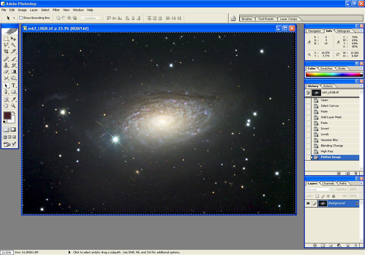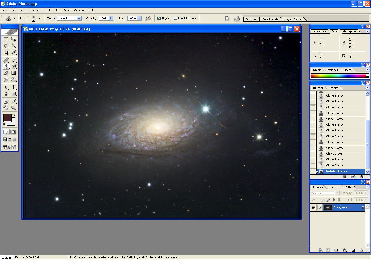 The following steps illustrate the processing of an image of m63, beginning with